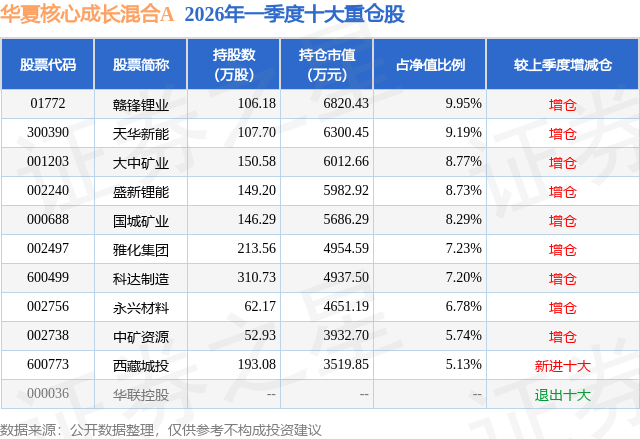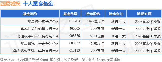 根据2026基金Q1季报公募基金重仓股数据,重仓该股的公募基金共5家,其中持有数量最多的公募基金为华夏基金的华夏核心成长混合A。华夏核心成长混合A目前规模为2.96亿元,最新净值1.0105(4月23日),较上一交易日下跌3.04%,近一年上涨38.88%。该公募基金现任基金经理为时赟凯。时赟凯在任的基金产品包括:华夏新起点混合A,管理时间为2026年2月26日至今,期间收益率为-8.55%;华夏清洁能源龙头混合发起式A,管理时间为2026年2月26日至今,期间收益率为3.32%。