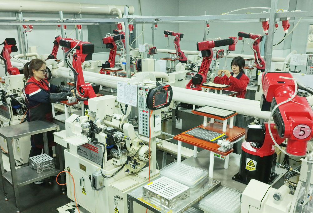 工人在位于湖北省秭归县的宜昌旌拓光学有限公司智能生产线日摄)。新华社发(王罡摄)